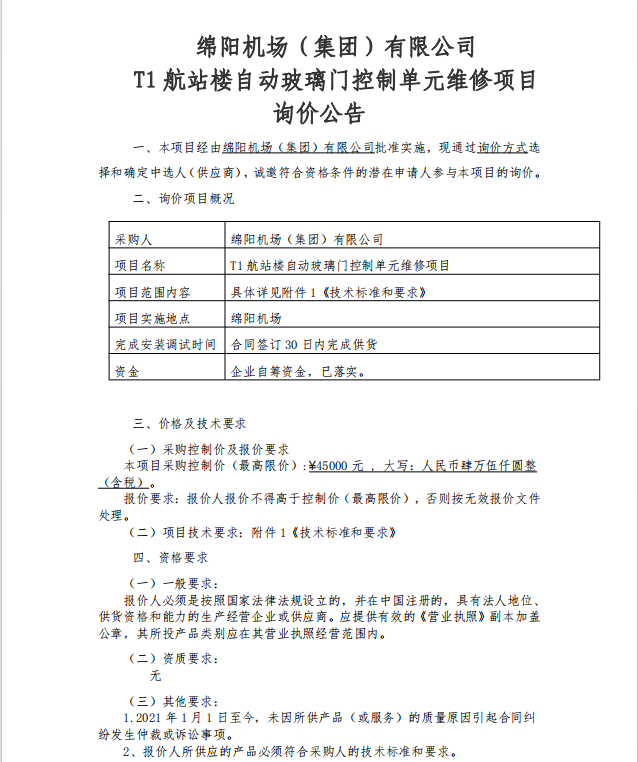 綿陽機(jī)場(集團(tuán))有限公司 T1航站樓自動(dòng)玻璃門控制單元維修項(xiàng)目詢價(jià)公告