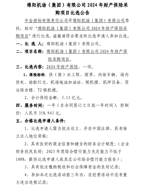 綿陽機(jī)場(集團(tuán))有限公司2024年財產(chǎn)保險采購項目比選公告