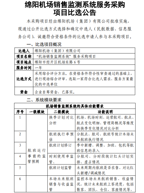 綿陽機場銷售監(jiān)測系統(tǒng)服務采購項目比選公告