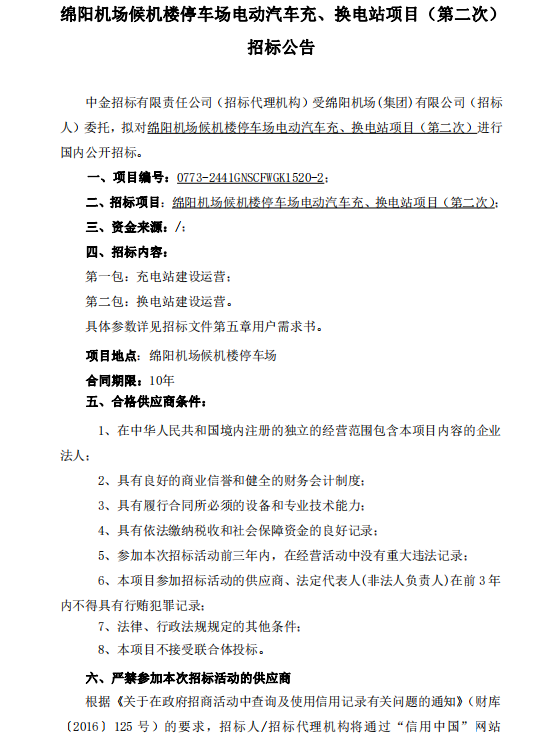綿陽機(jī)場候機(jī)樓停車場電動(dòng)汽車充、換電站項(xiàng)目(第二次)招標(biāo)公告
